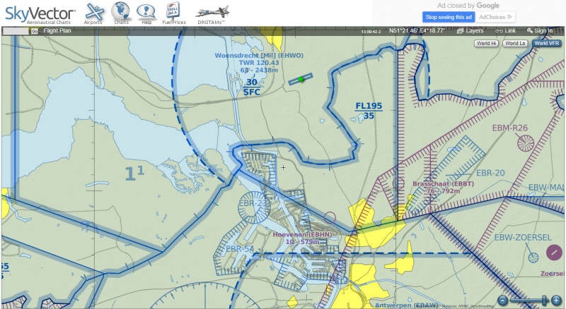 Op SkyVector kan je ook veel informatie vinden over flyzones en No-flyzones Metar en Taf